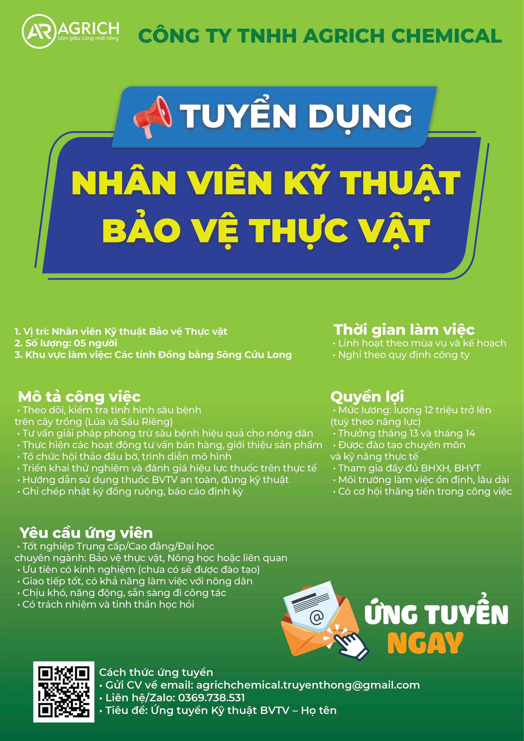 2026/03/26: Công ty TNHH Agrich Chemical-AGRICH: Nhân viên kỹ thuật bảo vệ thực vật