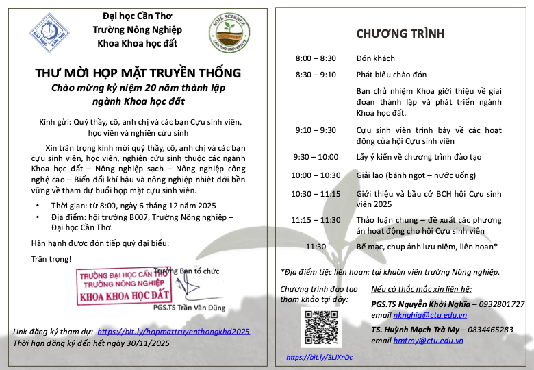Hướng tới chào mừng ngày đất thế giới và ngày kỷ niệm 20 năm thành lập ngành Khoa học đất thuộc Trường Nông nghiệp, Đại học Cần Thơ. Khoa Khoa học đất xin thông báo buổi họp mặt truyền thống năm 2025: